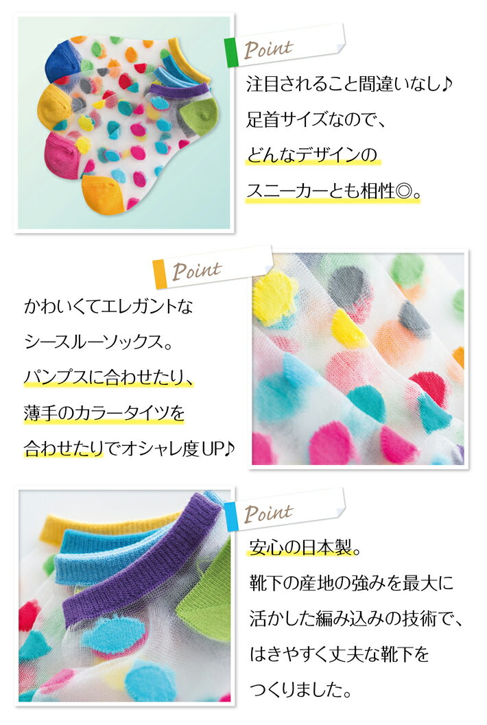 靴下 レディース ソックス スニーカーソックス カラフル カラー 派手 おしゃれ 可愛い かわいい 日本製 シースルードット柄