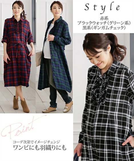 大きいサイズ アウター ママ 産前・産後 授乳口付 袖がロールアップできるビエラ起毛前開きマタニティシャツワンピース 秋 マタニティ 3L/4L ニッセン